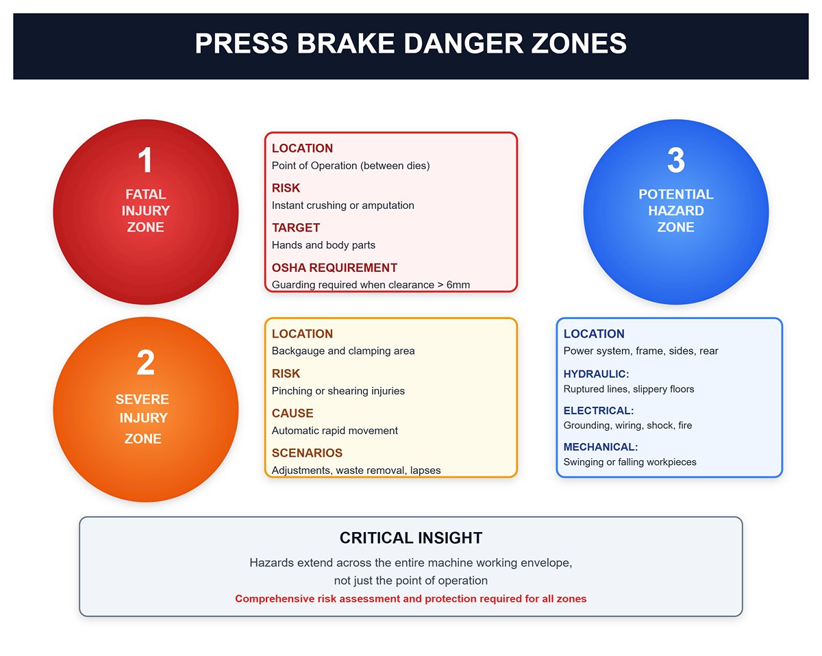 The hazards of a press brake extend far beyond the moment the upper and lower dies close. A comprehensive risk map should encompass the machine’s entire working envelope, segmented by hazard severity.