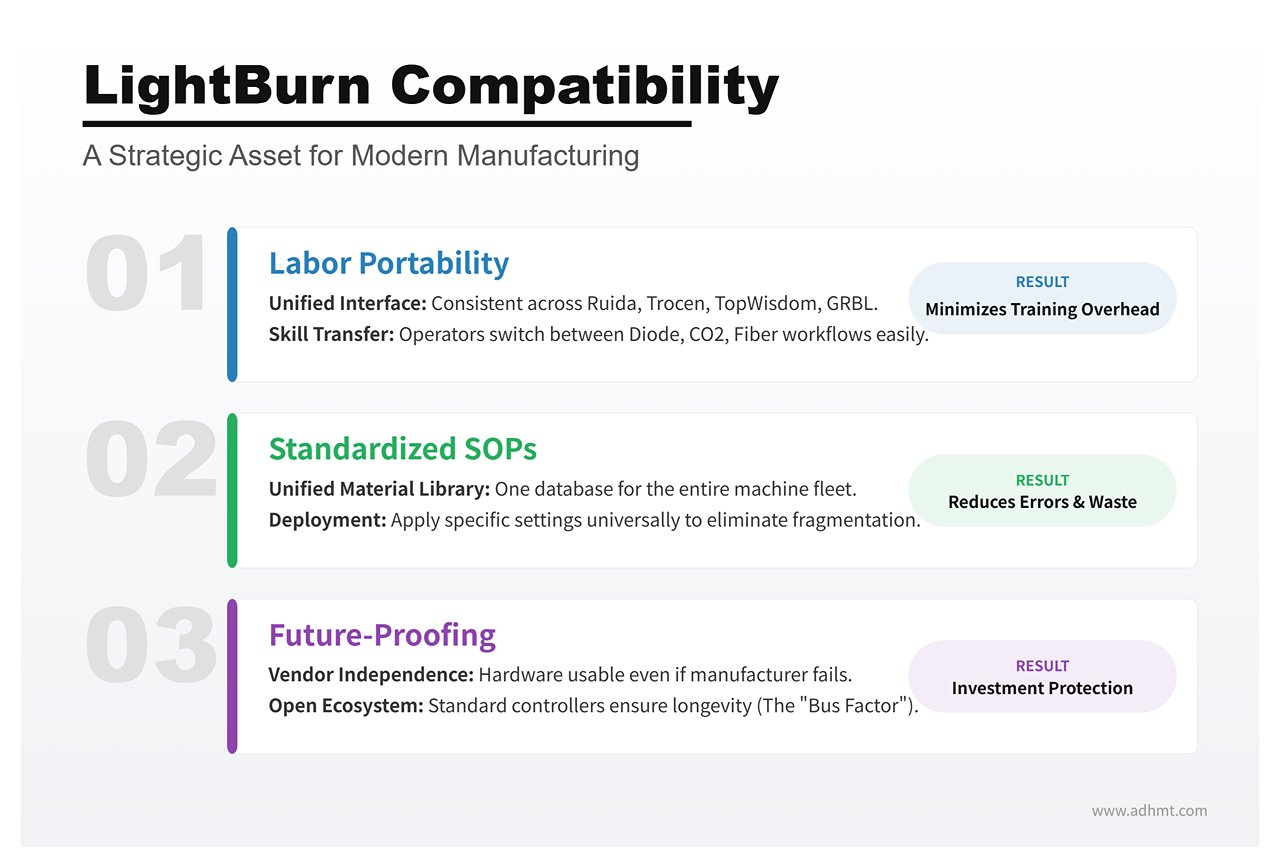For a workshop, "LightBurn Compatibility" is not a preference; it is a strategic asset for three reasons: