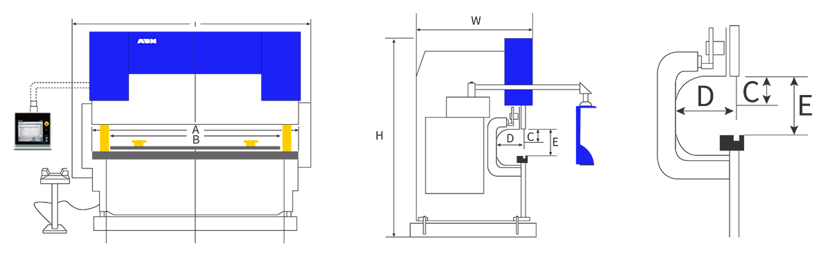 | Model | Bending Force | Bending Length (A) | Oil Tank | Aprroaching Speed | Ram Speed | Return Speed | X-axis stroke | X-axis Speed | R-axis stroke | R-axis Speed | Column Distance (B) | Throat Depth (D) | Stroke (C) | Daylight (E) | Step/Servo Motor | Weight | Dimensions |